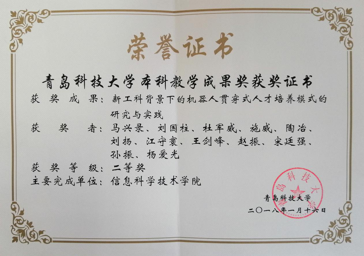 4、青岛科技大学教学成果奖--新工科背景下的机器人贯穿式人才培养模式的研究与实践