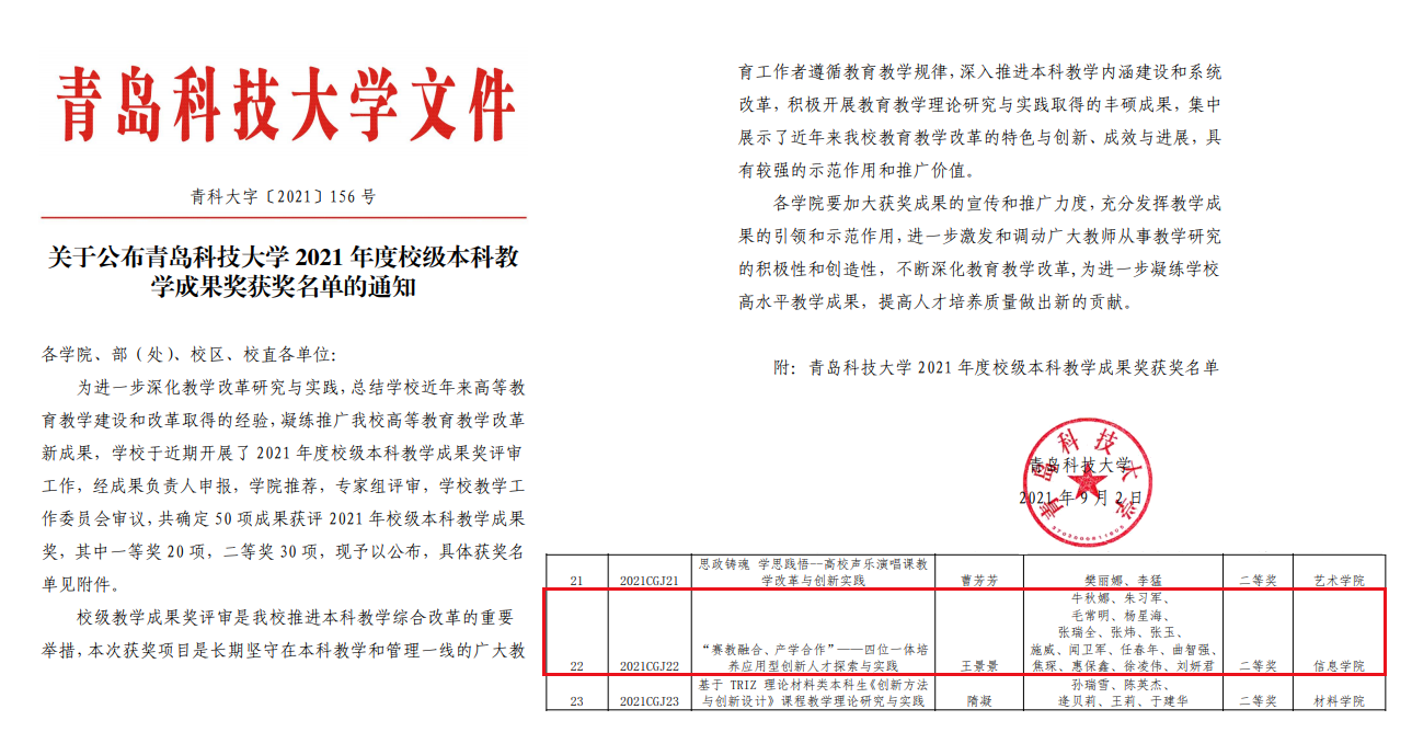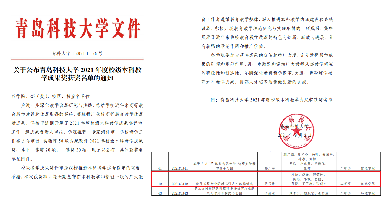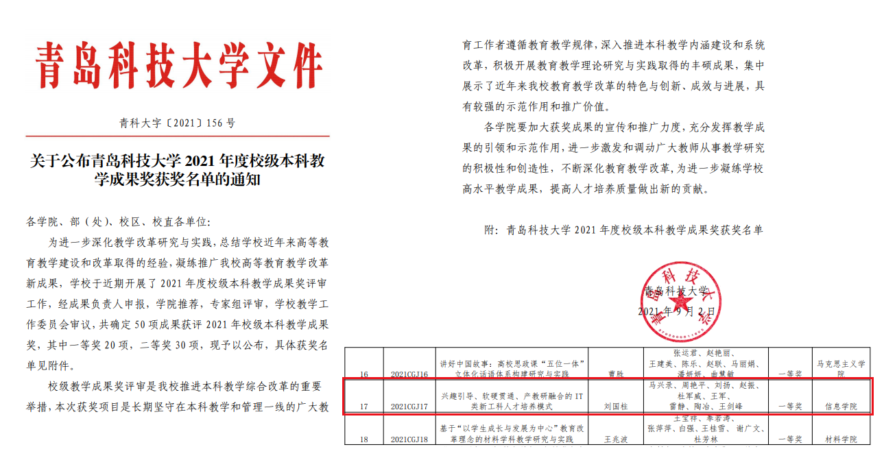 1、青岛科技大学教学成果奖--兴趣引导、软硬贯通、产教研融合的IT类新工科人才培养模式