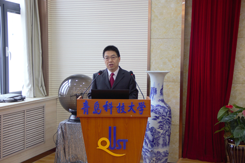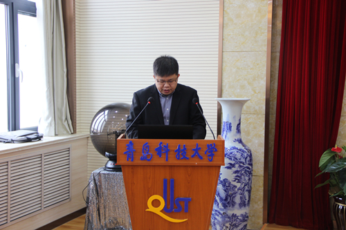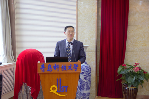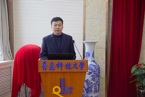 青岛科技大学副校长吕万翔为院校友会授旗并发表讲话,简单介绍了学校的整体情况,并希望广大校友和学校一起努力,为母校的发展贡献力量。